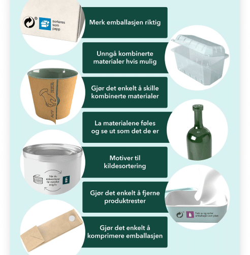 Denne guiden, utviklet av Grønt Punkt Norge, gir deg veiledning og råd som øker sannsynligheten for at din emballasje går inn i kretsløpet.